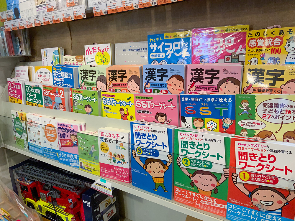 かもがわ出版さんは、特別支援のために開発された教材や、遊びながら学べる教材を多く取り揃えています。今回のフェアでは見本もできるだけご用意しました。