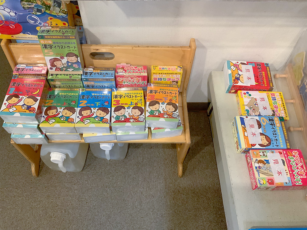 ロングセラー「漢字イラストカード」の見本もご用意しています(右側)。この機会に内容をご覧ください。