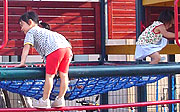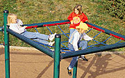 のんびりと空中散歩を楽しめるフラットネット。ネットの目合いには100ミリと300ミリがあります。100ミリは落下の危険性はありませんが、遊びのレベルも低くなります。300ミリは身体が抜けたときに首が引っかからないように設定されたサイズです。何も抵抗しなければ、そのまま下に落ちてしまいます。でも、登り遊びに慣れた子ども達には、ちょっとした休憩スペースにさえなるのです。「こんなところでは休めない」と思いますか?彼らの体重なら、これでも十分に楽な姿勢でいられるのです。