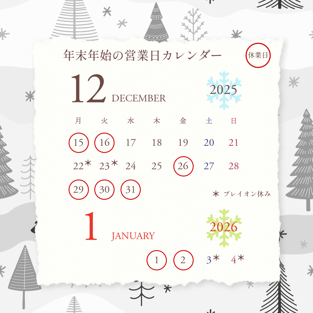 年末年始は、仕入れ先からの入荷がストップし、当店も年末年始休暇があるため、お待たせする時間が長くなります。また、雪の影響で遅配が生じる可能性もあります。 詳細はヤマト運輸サイトなどでご確認ください。