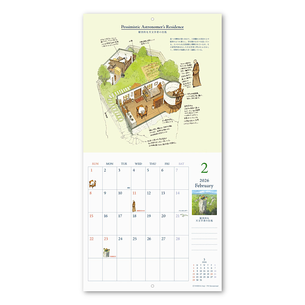 物語に出てくるようなユニークな家とその設定を描き、ロングセラーとなっている『ものがたりの家』が壁掛けカレンダーになりました。月が変わるごとに新しい物語の世界を楽しめます。日付の欄は日曜はじまりで書き込めるスペースもあり、予定の管理にも役立ちます。