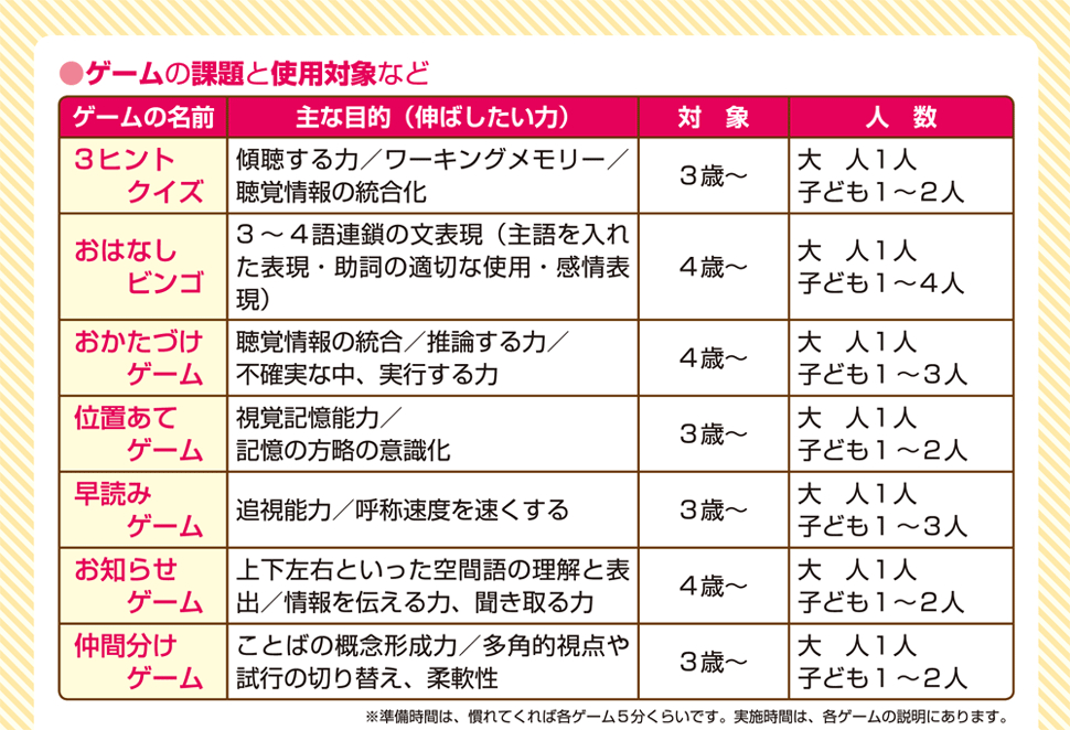 発達に軽度の遅れや偏りのある広汎性発達障害や、はっきりした診断はないが「話し言葉の数が少ない」「人に話を最後まで聞けない」「正しい構文で話すことができない」など、コミュニケーションの課題を持っている子どもに使ってもらえます。また、学習の基礎となる「聞く」「話す」「推論する」などの力を育てます。親子でも子ども同士でもできるので、通級指導教室、個別の指導、小グループ指導、家庭でも使えて楽しく学べます。幼児から学童期が対象。