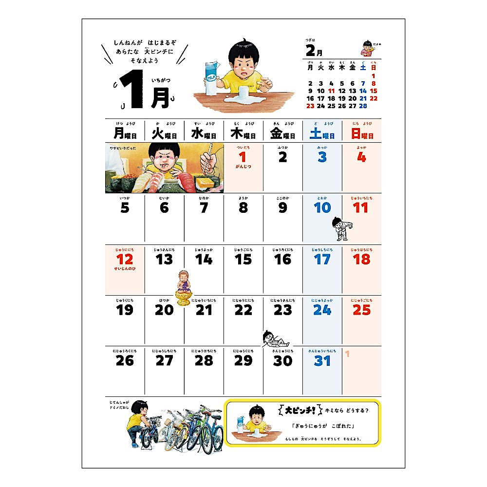 大ベストセラー絵本「大ピンチずかん」の月曜始まりカレンダー。毎月、大ピンチなシーンを描いた色彩豊かな絵を親子で楽しめます。楽しく遊べるおまけコーナーやシール付き。ひらがなで書かれているので難しい日にちの読み方が学べます。