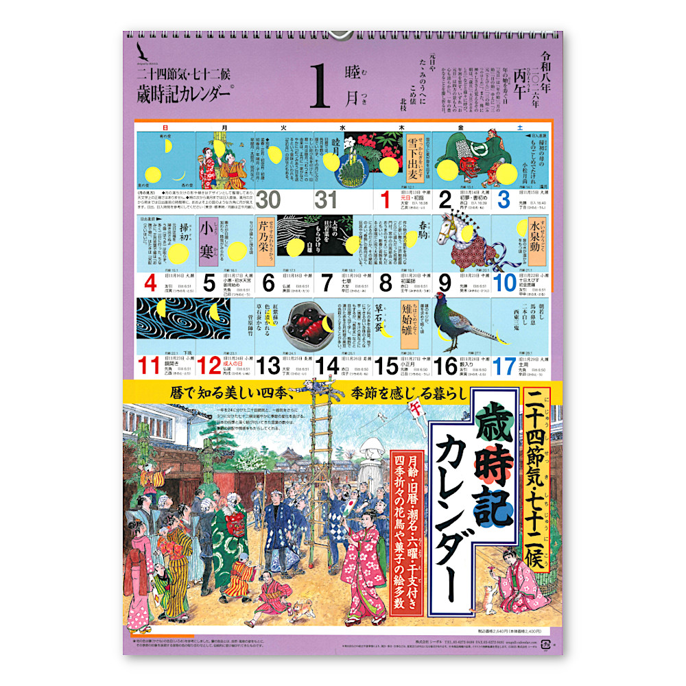 気候の推移を約15日ごとに追った「二十四節気」(春分・秋分・夏至・冬至など)と、節気をさらに5日ごとに分け自然現象を解いた「七十二候」を併せて構成しています。それぞれの節気・候にちなんだ、見て楽しい、読み物も掲載。
