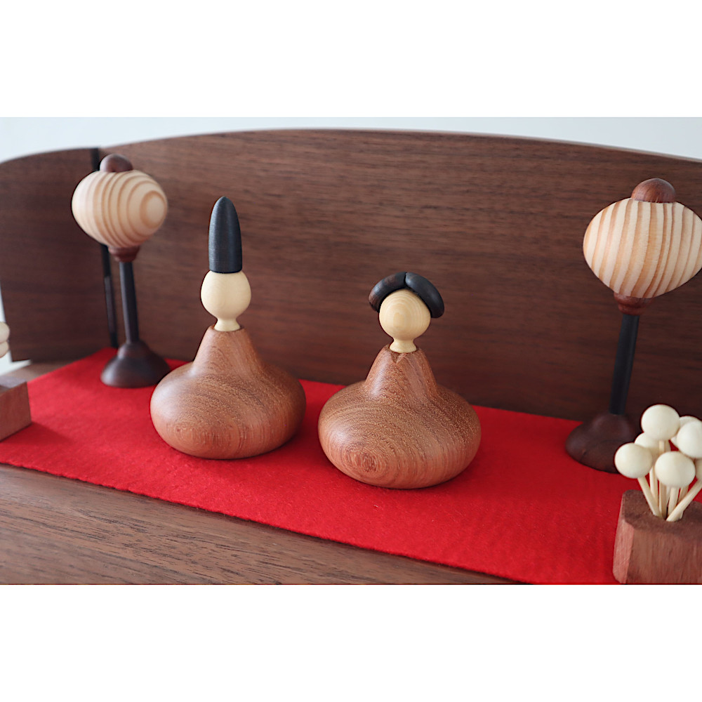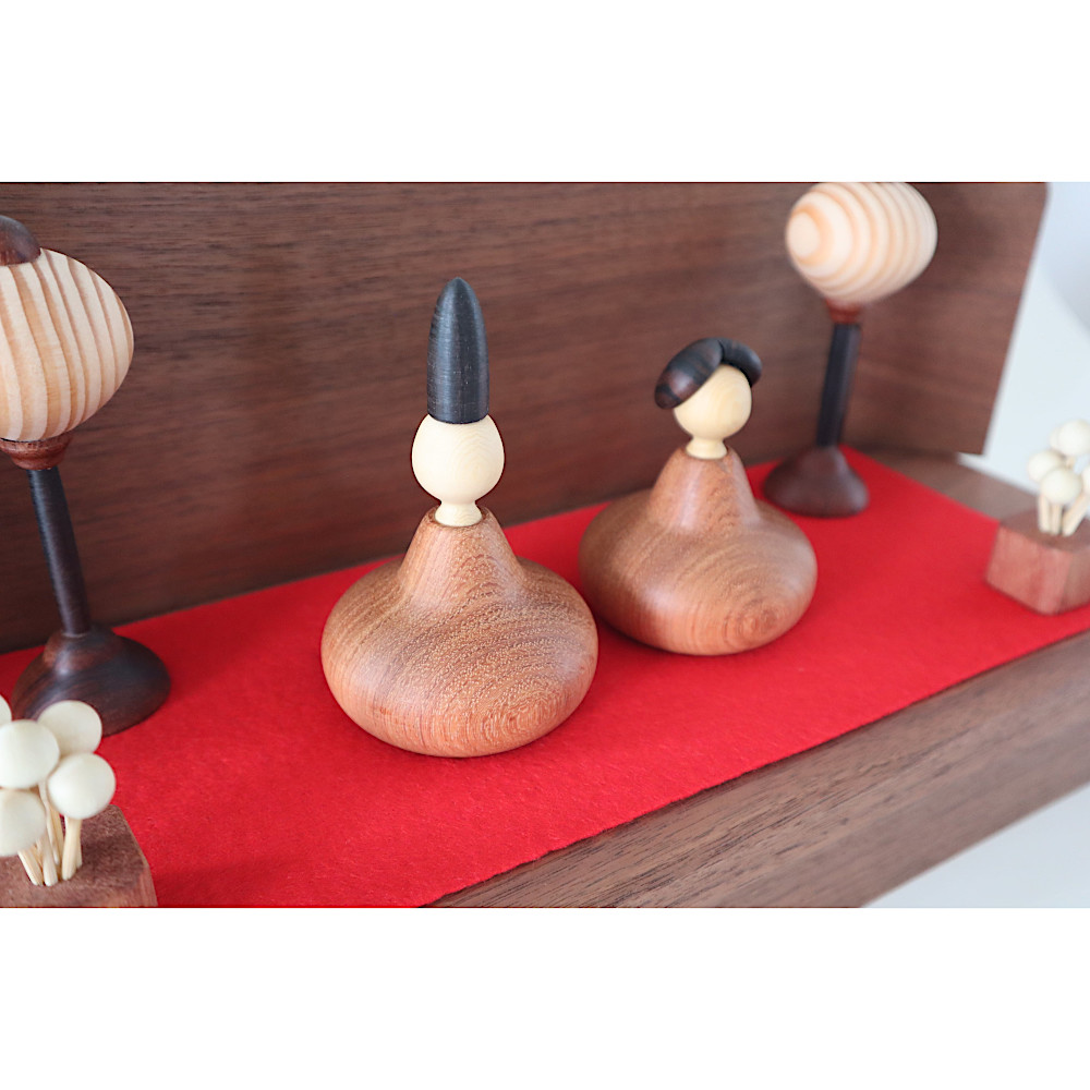 | 素材: | ひな(カリン、ヒバ、コクタン)、ぼんぼり(カリン、カラマツ、コクタン)、花(ミヅキ、竹、カリン)、ひな台(ウォールナット) |