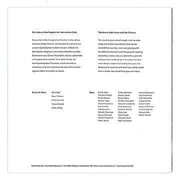ネフ社の積木が持つ幅広い楽しさ、面白さ、そして無限の可能性がこのブックレットに詰まっています。ネフスピール、リグノ、キュービックス、ダイアモンドといったネフ積木のロングセラーから、ヴィボ、レインボウといった新定番、そして クルト・ネフ氏の晩年の作品ムルティム、スカレッタ、レゴロまで、13点の積木のパターンが計170点以上掲載されています( 2007年に初版が発行され、2009年版では表紙が「ネフコレクション」と共通のデザインに変更されました)。