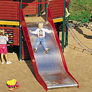 波形すべり台はHAGSでも長い歴史を持つ遊びです。すべり台は身体の不安定を克服する最も代表的な遊びですが、表面が波形をしていることで、その機能をより効果的にしています。100%ステンレス製の滑走面は表面をエンボス加工しました。