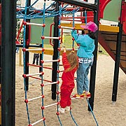縄ばしごを横につないだようなラダー。垂直のものと傾斜のついたものとがあります。階段やステップラダーよりもやや高度な登り遊びです。