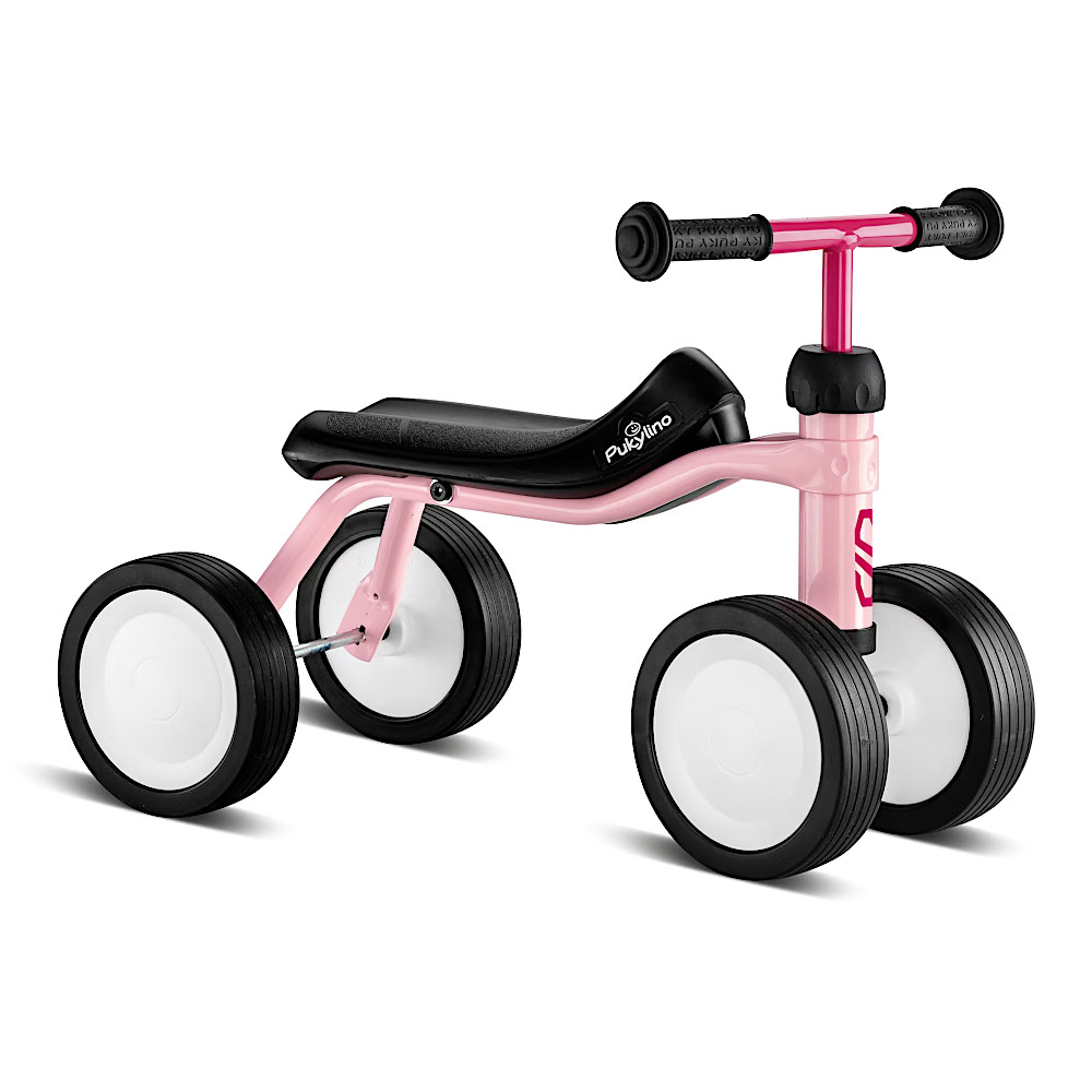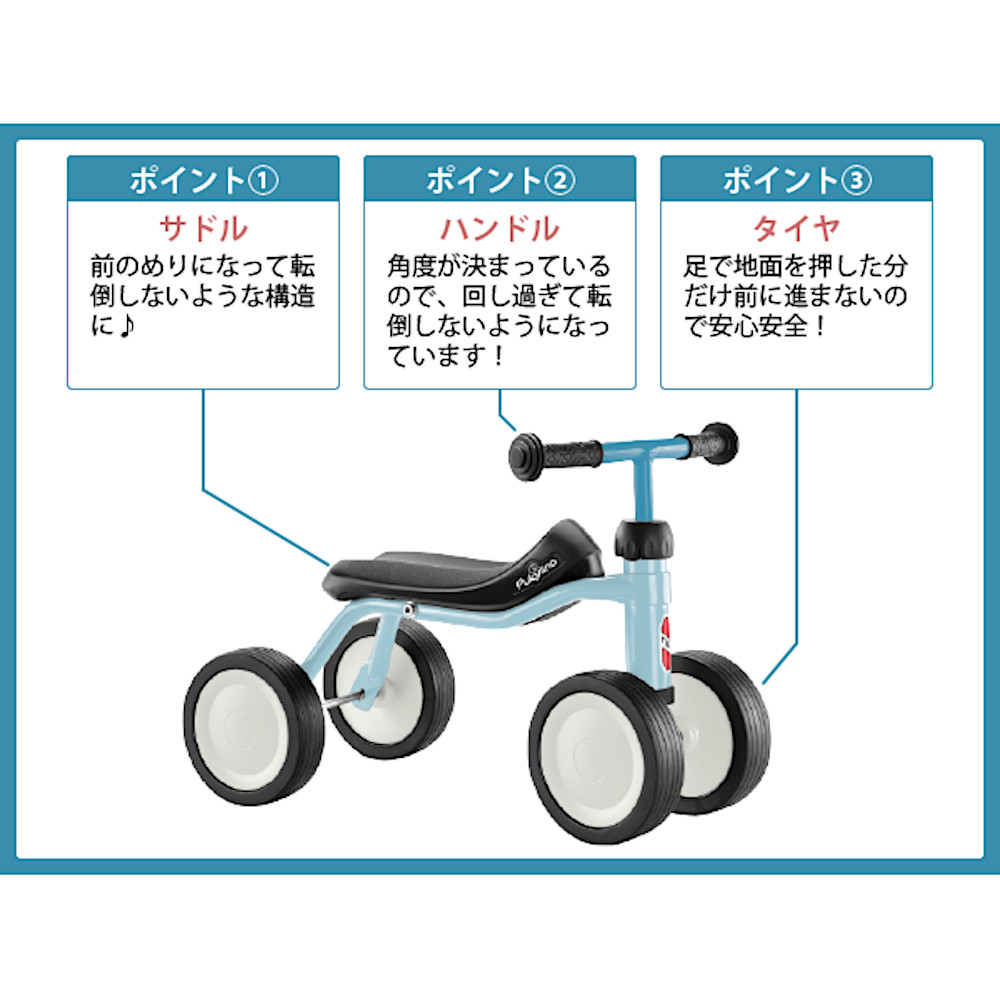 最初の乗り物としておすすめなのが、この室内用のプッキーリノです。プッキー社の長年の開発で生まれた、特別な形状は、乗り降りや、両足で地面を蹴る動き、ハンドル操作などの運動に必要なプロセスが、遊びの中で自然に組み込まれるようになっています。