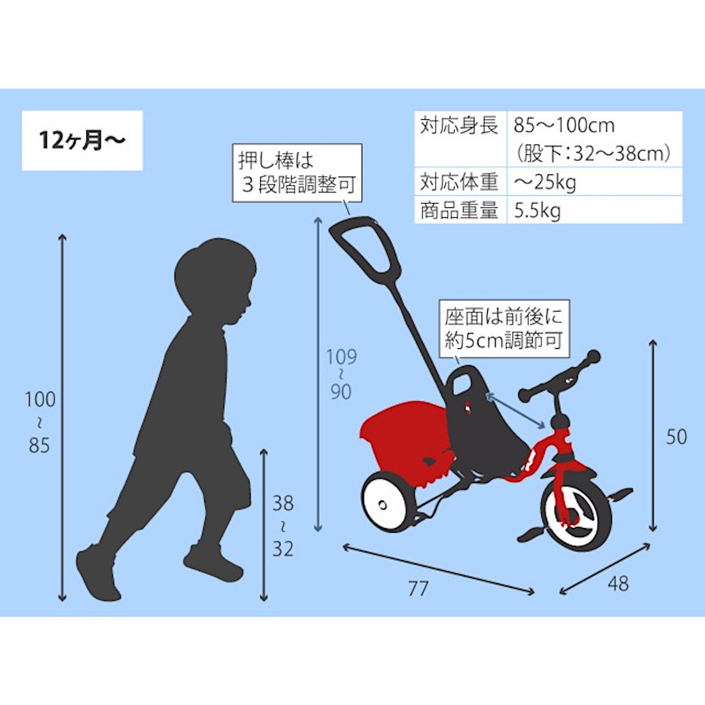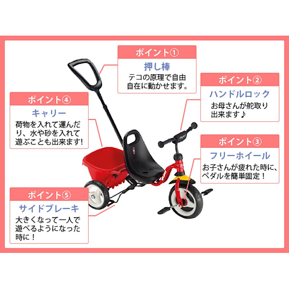 注意事項: | 家庭向けの三輪車です。保育施設など家庭以外での多数のお子さんの使用を想定していません。保育施設など家庭以外での使用による破損はサポート・保証対象外ですので、ご了承ください。 |