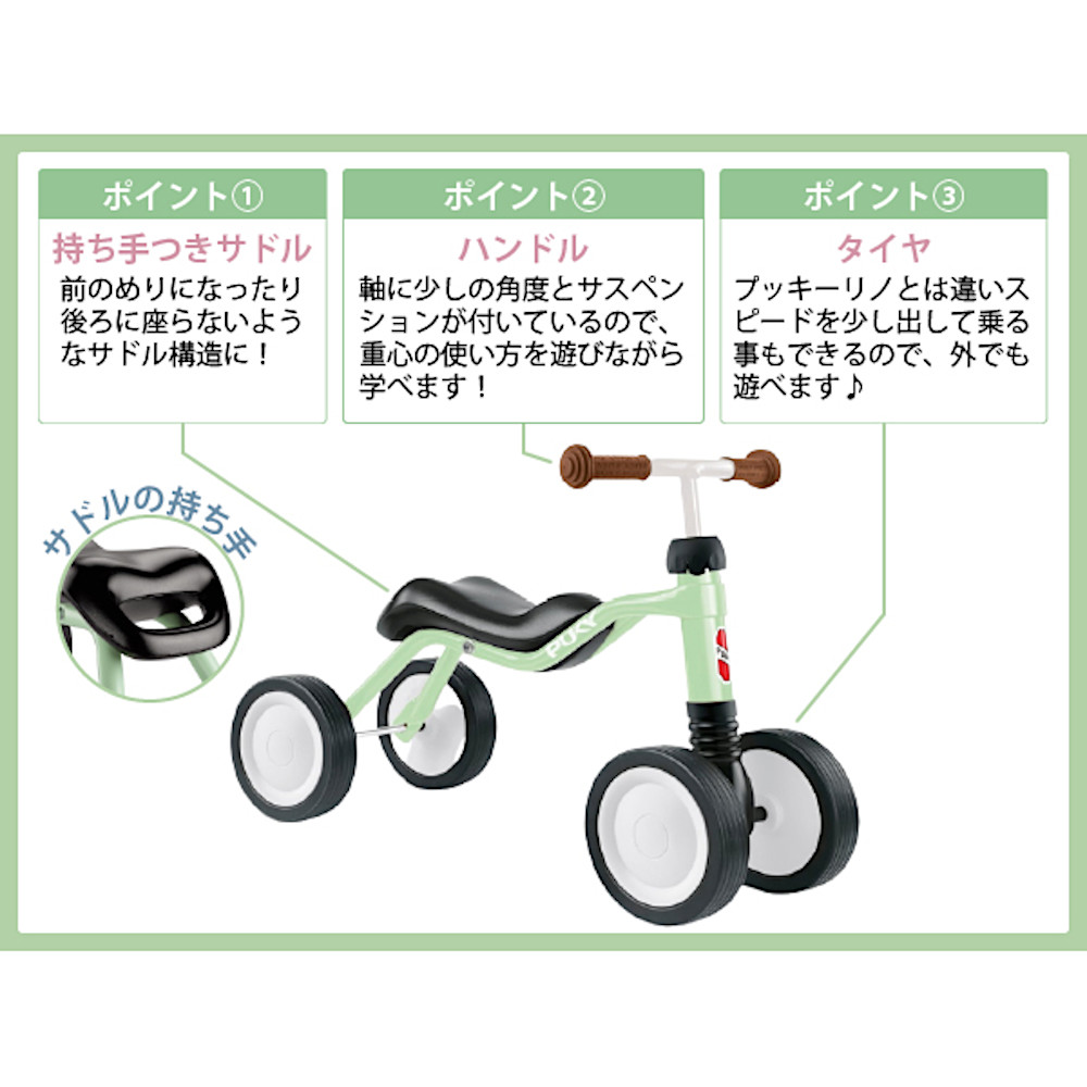 ヴッチは、乗り物専門メーカーのプッキー社の室内/室外どちらでも遊べる足こぎ四輪車です。歩きはじめの子どもの歩行を助け、バランス感覚が身につき、オススメです。