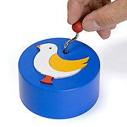 手でくるくる回すと短い曲が流れます。ハンドルを回すスピードを一定に保つのは意外に難しいのですが、子どもにとっては楽しい遊びになります。