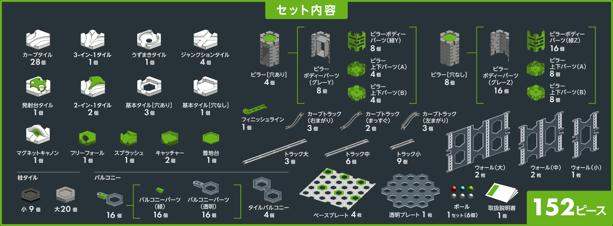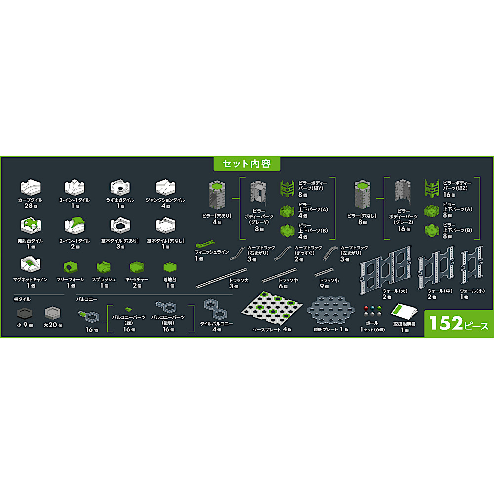 柱タイル7個分の高さを持つ「ピラー」、柱がない場所でもタイルを保持できる「バルコニー」、垂直な壁を作る「ウォール」を使い、垂直方向へレイアウトを発展させることで、高さのある立体的なコース作りが可能!既存パーツとの互換性があり、従来のコースをさらにエキサイティングに拡張できる。