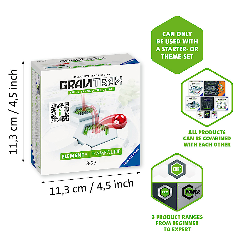 重力に逆らって、トランポリンでボールを印象的にバウンドさせましょう。 トランポリンとGraviTraxスターターセットを組み合わせて、より多くのアクションをルートに取り入れましょう。 ボールはトランポリンに対して、どれくらいの距離と高さでジャンプするでしょうか?