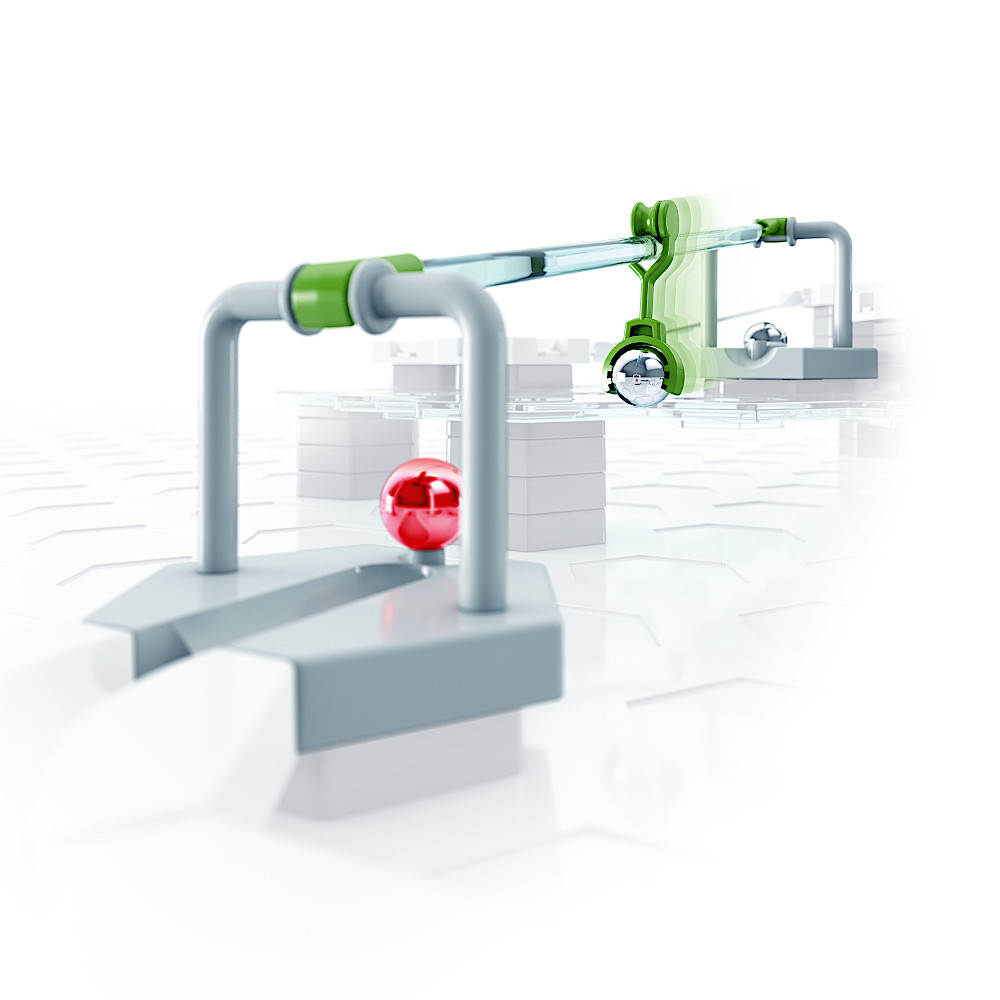 ジップラインに到達したボールによって、ハンマーパーツが動き出し、その先に置かれたボールを押し出します。セット内容