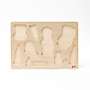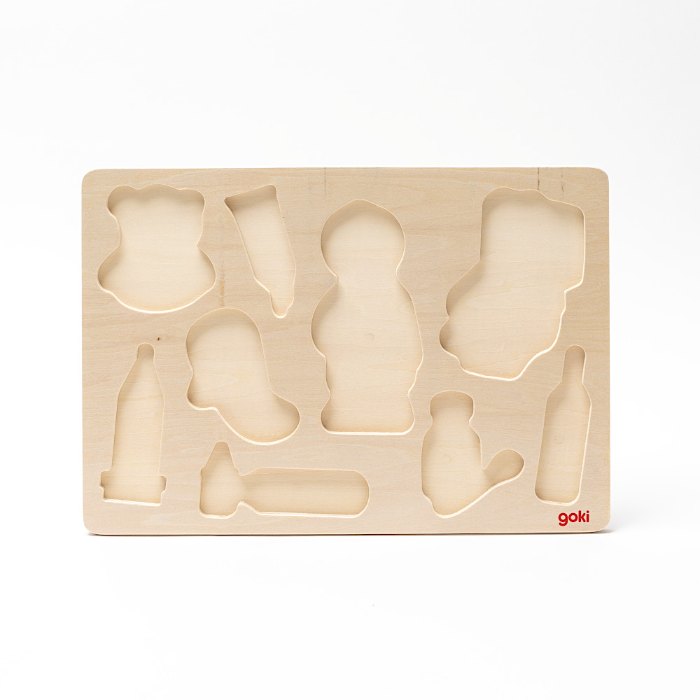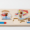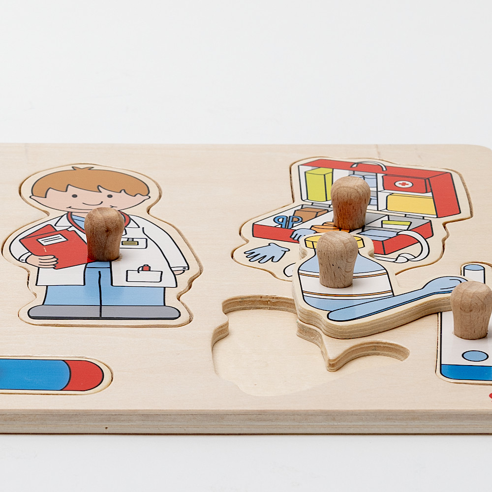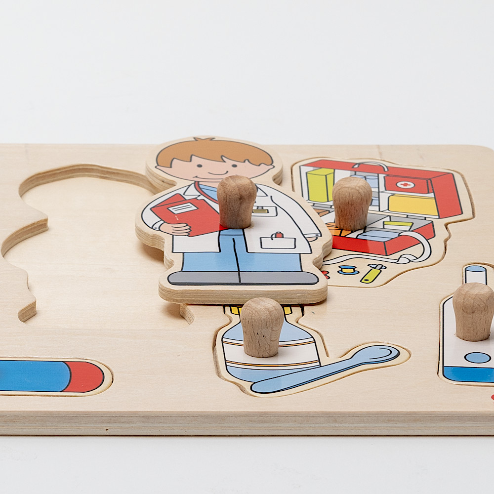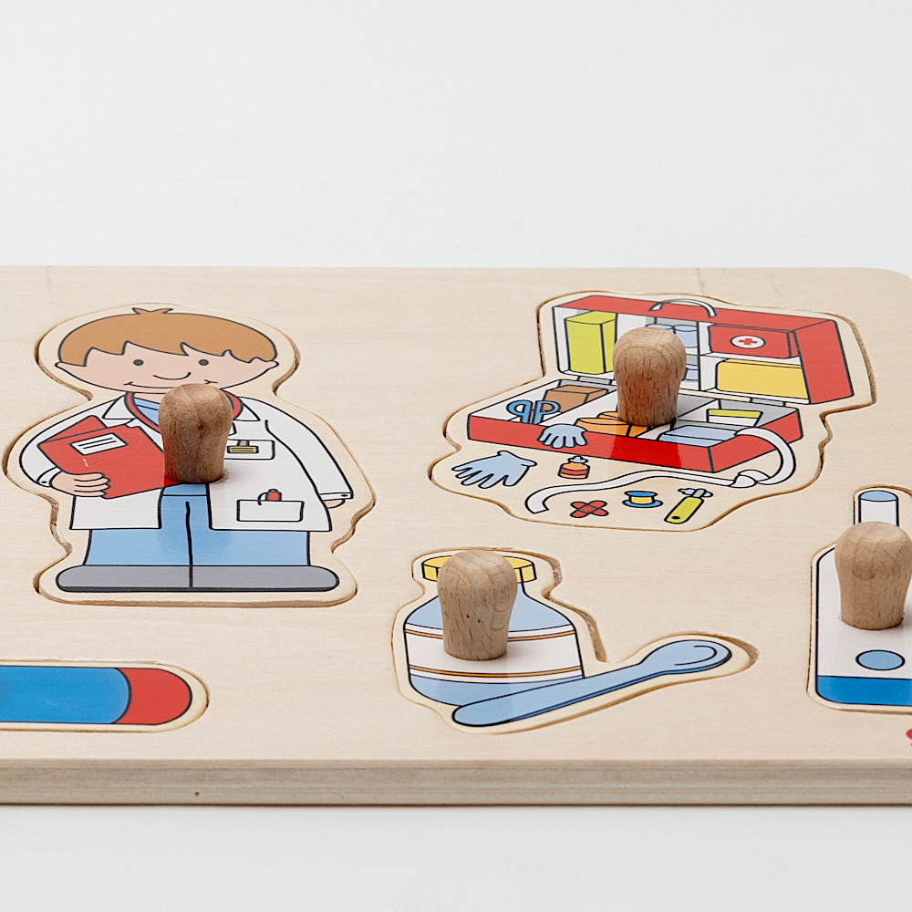 お医者さんと、聴診器や体温計、注射器などのペグ付きパズルです。何に使うか考えながら楽しめます。つまみの付いているパズルは小さい子でもはめやすく、はまったとき快感です。