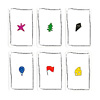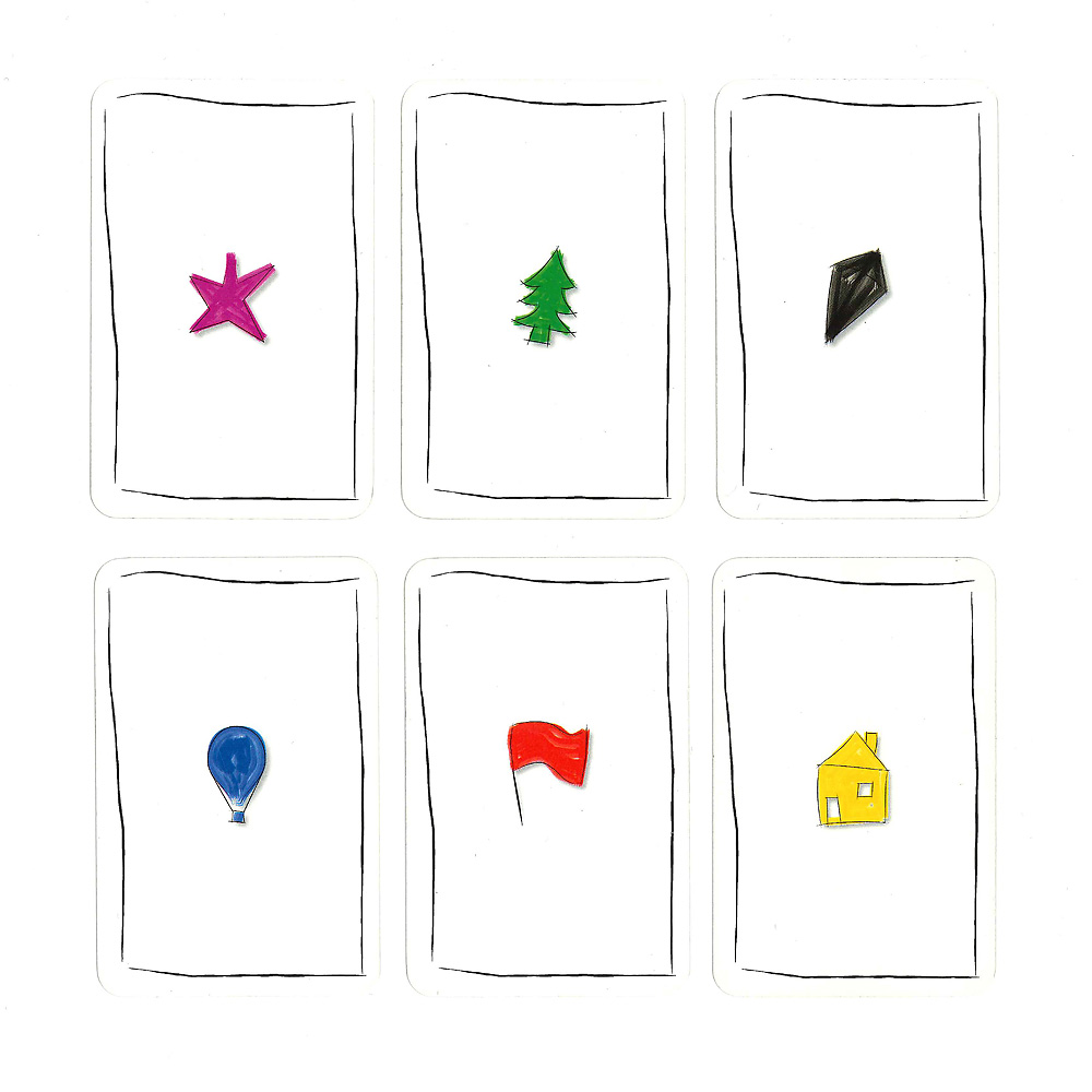 - カードは全部で60枚あり、6つの形それぞれ10枚ずつあり、1から5までの数が2枚ずつ含まれています。