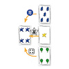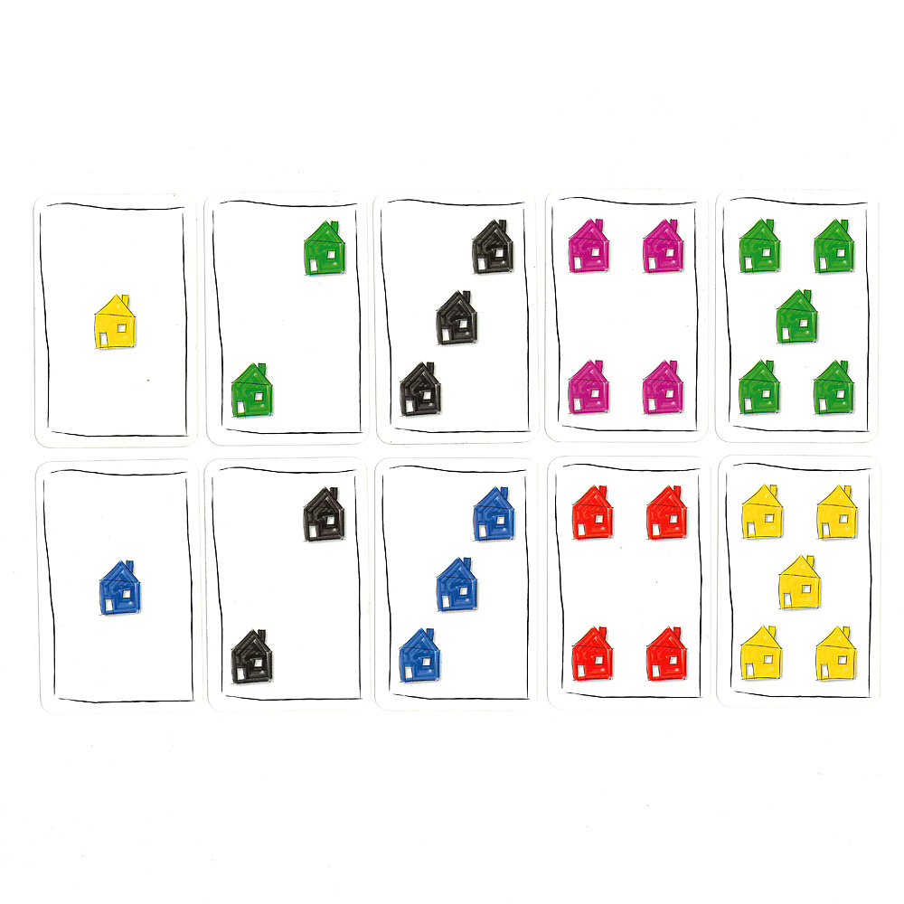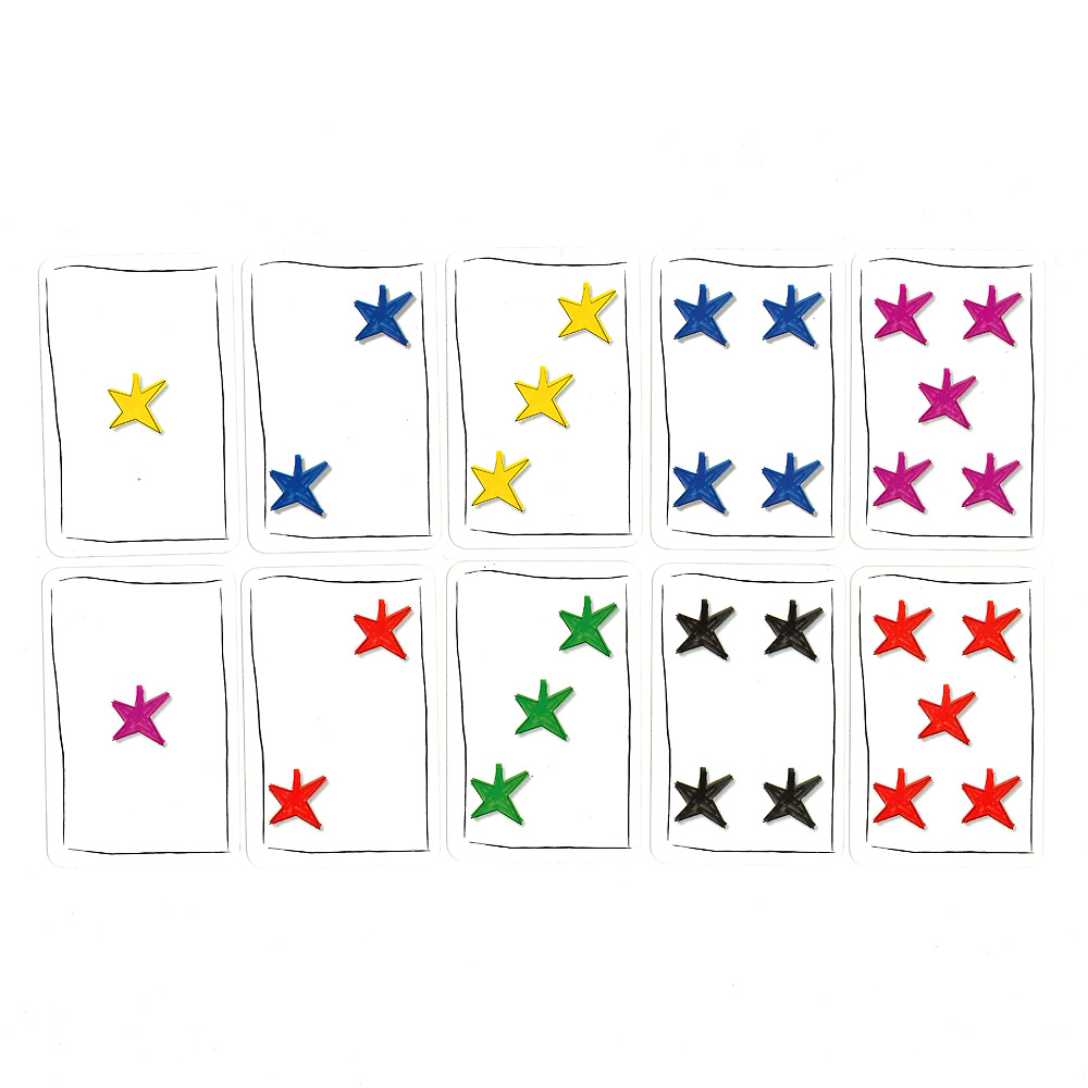 - 5までの数(数字ではなく個数)しか扱わないので、年長さんくらいから遊べる。しかも、トランプと違い、1つ小さいとか1つ大きいという数の操作がいらずに、同じ個数ならよいので、図(記号)として認識できる。