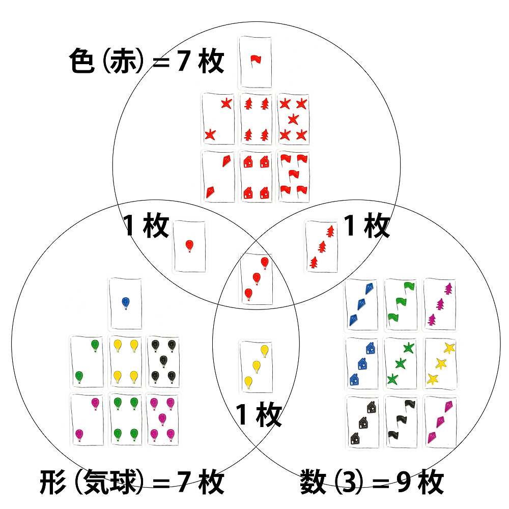 「赤い気球が3個」描かれたカードを見て、「これは『赤』の仲間であり、『気球』の仲間であり、『3』の仲間でもある」と瞬時に理解する。これは算数で学ぶ「集合」や「分類」の考え方そのものです。勉強としてではなく、ゲームの興奮の中で自然と「論理的思考」の土台が作られます。