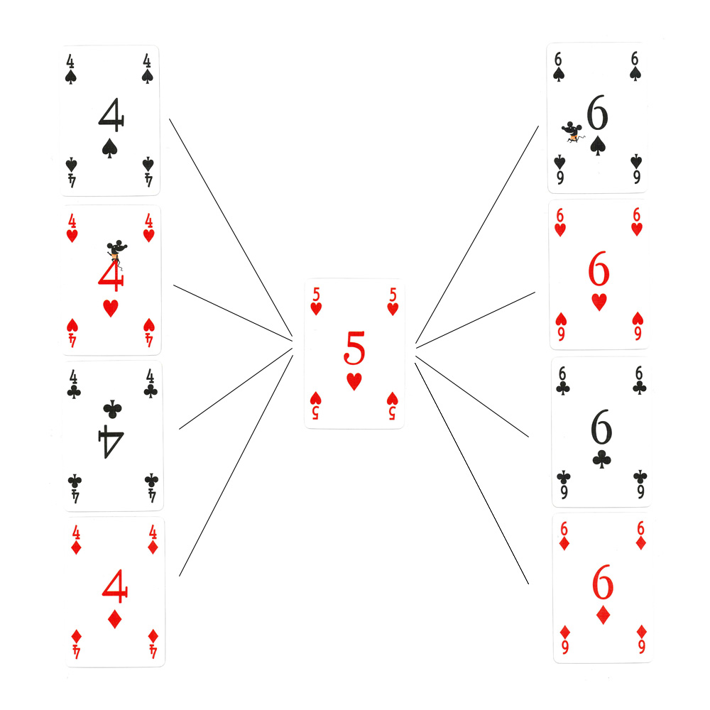 トランプのスピードでよくあるのが、「お互いに出せるカードがなくて、何度もやり直し……」というシーン。これでは、せっかくの熱狂が冷めてしまいます。 アドルンク版は、1枚のカードに対して「色・形・数」のどれかが合えばOK!次々に出せる快感が続くので、集中力が最後まで途切れません。