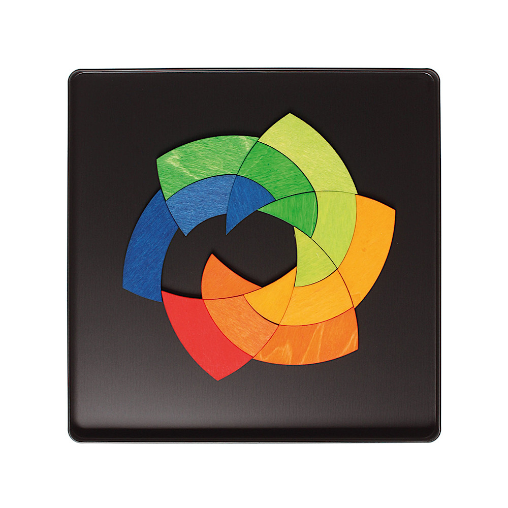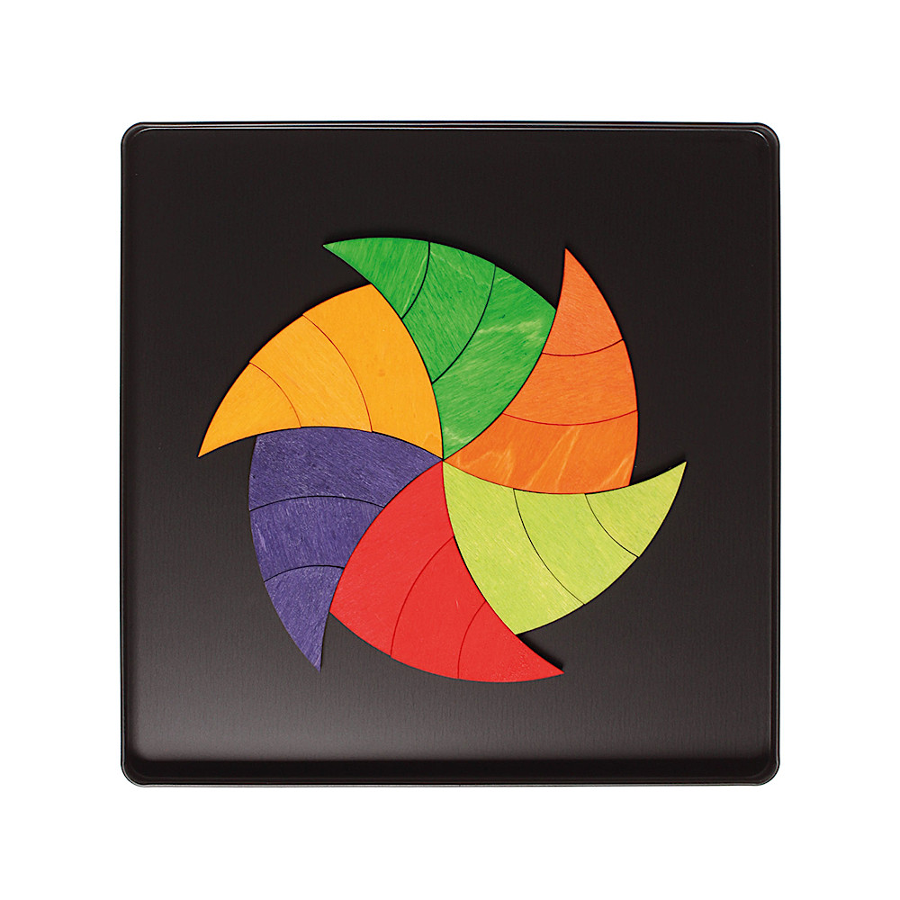 グリムスらしいカラフルな木製ピースの裏面に磁石が付いています。パッケージが缶になっており、そこに貼り付けて遊ぶことができます。