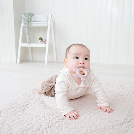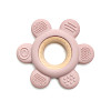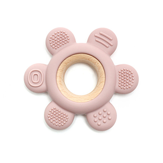 内側のリングは木製、外側はシリコン製の歯固めです。リングは木製でしっかりとにぎることができます。シリコン部分は花びらの部分に4種類の異なる突起があり、触り心地が異なります。リングは外せます。