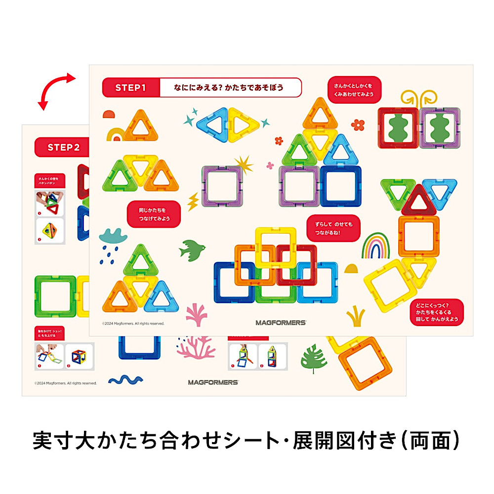 シリーズで一番ピースが少ない、10ピースのコンパクトなセットです。入っているのは正三角形と正方形のみ。基本の形に集中して、シンプルに遊ぶことができます。かたち合わせシートのSTEP1は平面遊び。原寸大シートにピースを重ね、「なににみえる?」と問いかけることで、子どもの想像力を引き出します。