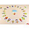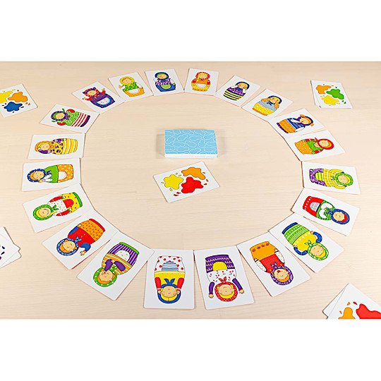 場に並んだ、さまざまな色の服を着たマトリョーシカのイラストから、カードに描かれた3色の組み合わせの服を着た1人を急いで探し、その人がしているポーズをいち早く真似することで、たくさんのカードを集めるゲームです。