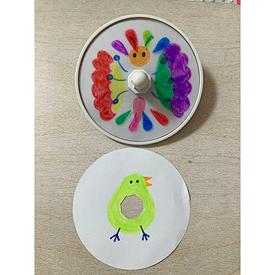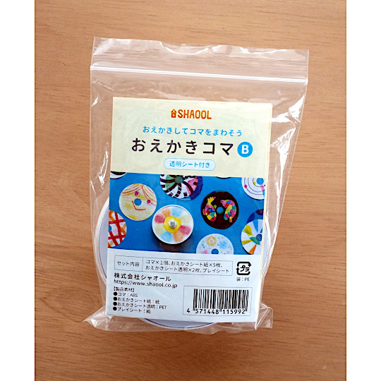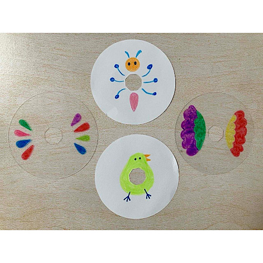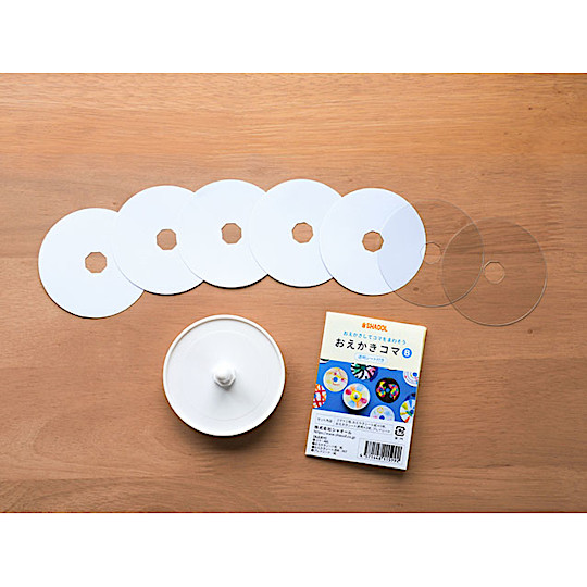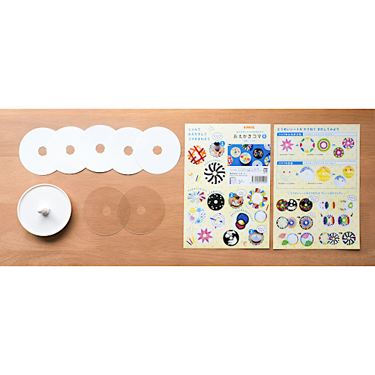 自分で描いた好きな絵を独楽にして回すことのできるセットです。白い紙以外に、透明のシートも入っているので、下の絵を重ねるような絵を描くこともできます。