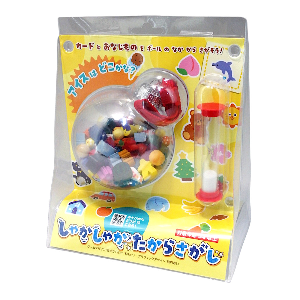 しゃかしゃかボールの中には、様々なイラストの木駒やビーズがたくさん入っています。カードをめくり、そこに描かれたイラストと同じ木駒を探しましょう。その名の通りしゃかしゃかボールをしゃかしゃかすれば、きっと見つけられるはず。砂時計を使って、制限時間内に何個見つけられるか挑戦してみましょう。1人でも遊べて、親子でじっくり遊べるゲームです。