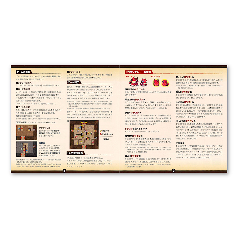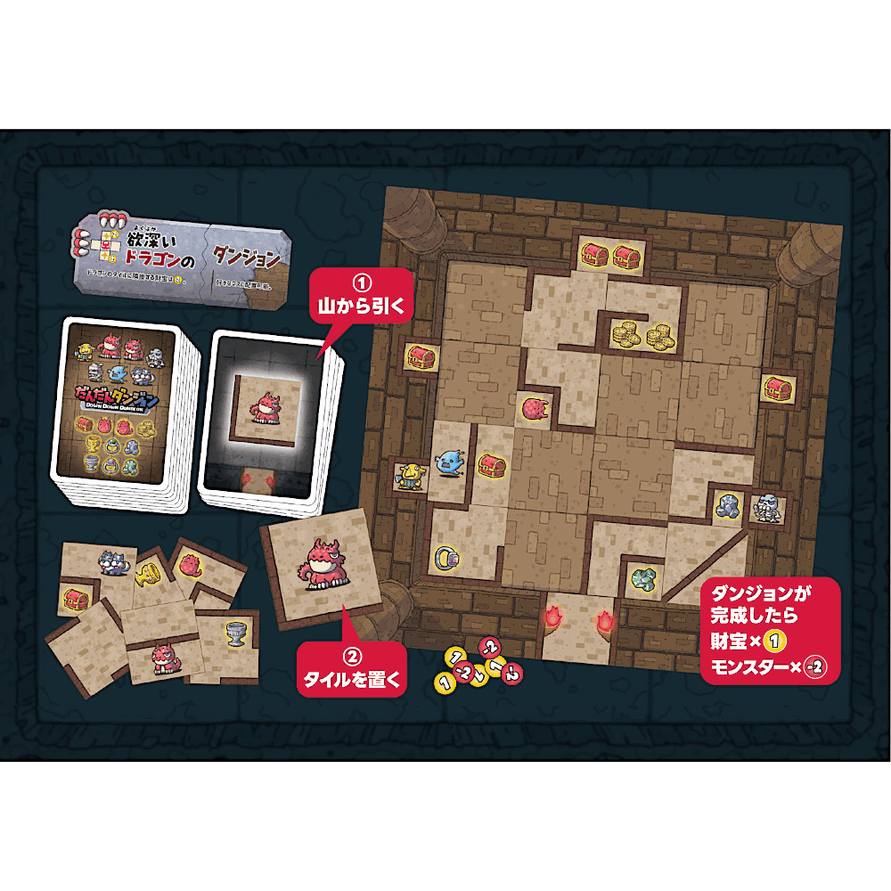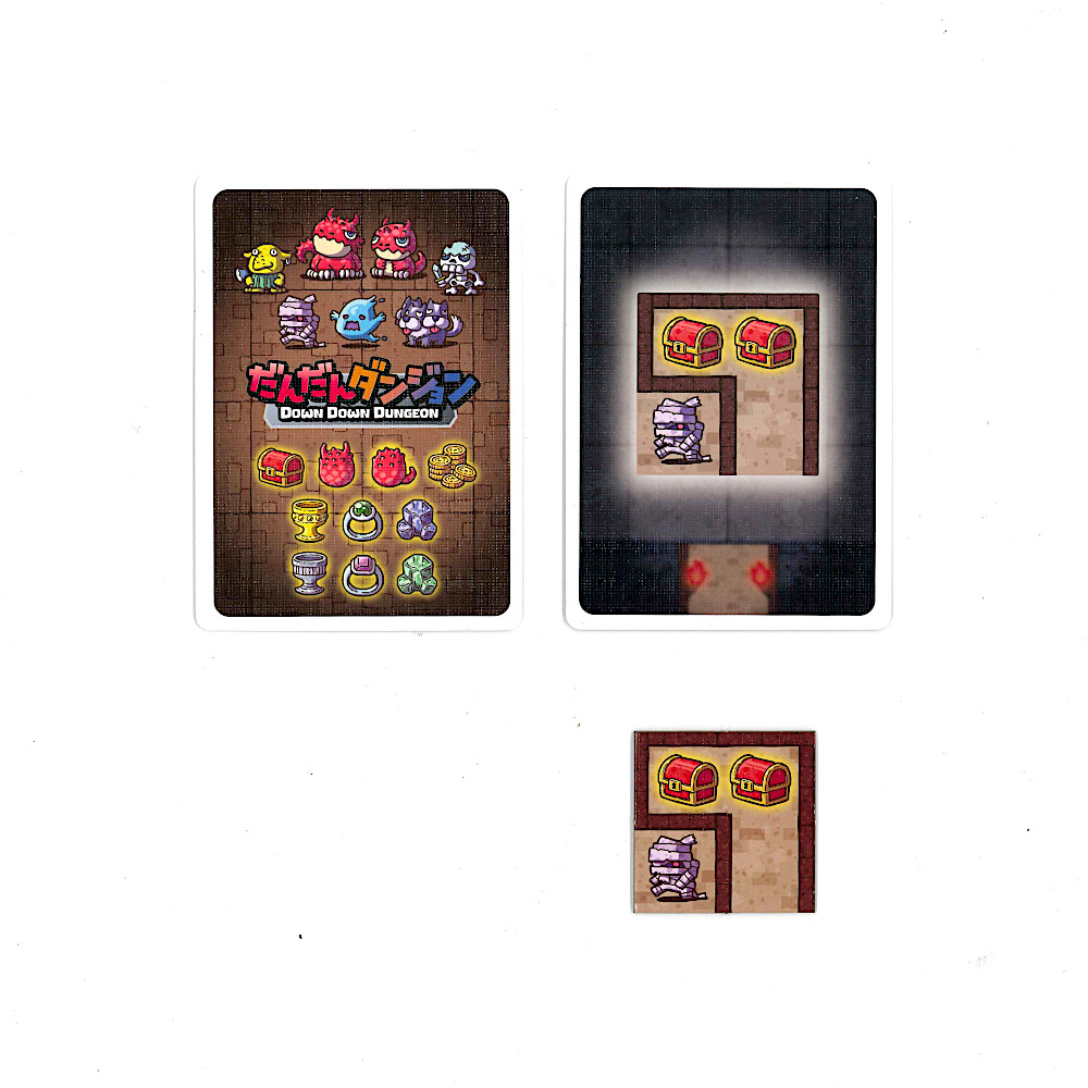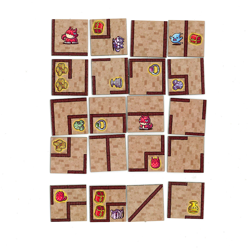 タイルを配置することでだんだんダンジョンが出来ていきます。入口からダンジョンに入り、壁を上手く使ってモンスターを回避します。奥の方にも財宝がありますが、その分モンスターに遭遇する危険も高まります。タイルを16枚置き終えたらゲーム終了です。出会った財宝(1点)とモンスター(-2点)を数え、最も点数の高い人が勝者となります。大人が手軽に遊ぶのにも最適です。