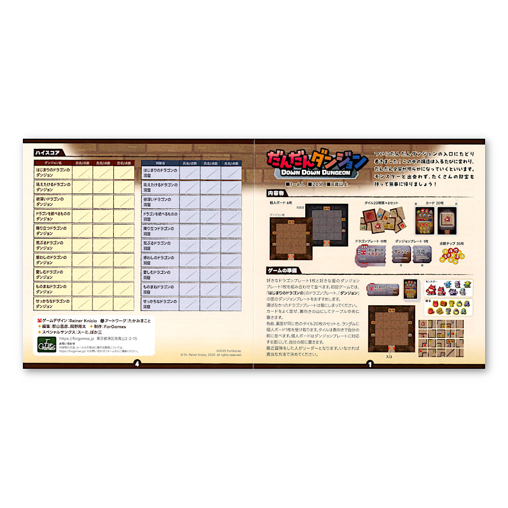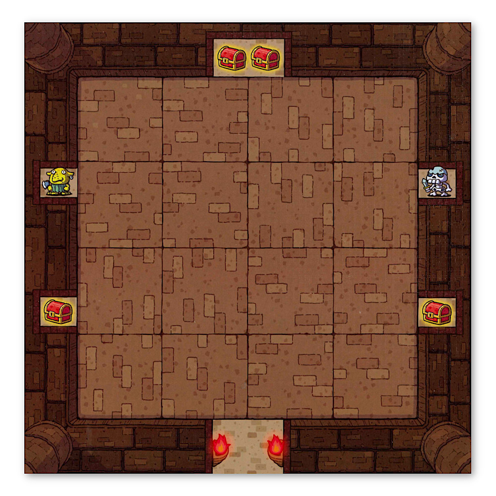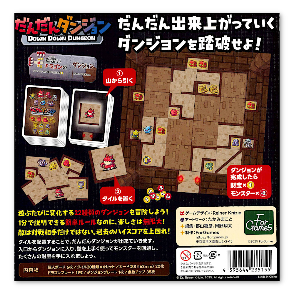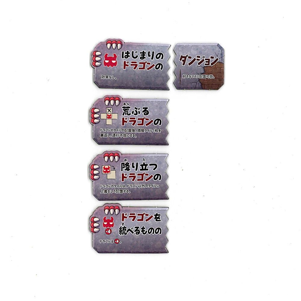 タイルを配置することでだんだんダンジョンが出来ていきます。入口からダンジョンに入り、壁を上手く使ってモンスターを回避します。奥の方にも財宝がありますが、その分モンスターに遭遇する危険も高まります。タイルを16枚置き終えたらゲーム終了です。出会った財宝(1点)とモンスター(-2点)を数え、最も点数の高い人が勝者となります。大人が手軽に遊ぶのにも最適です。