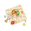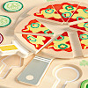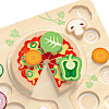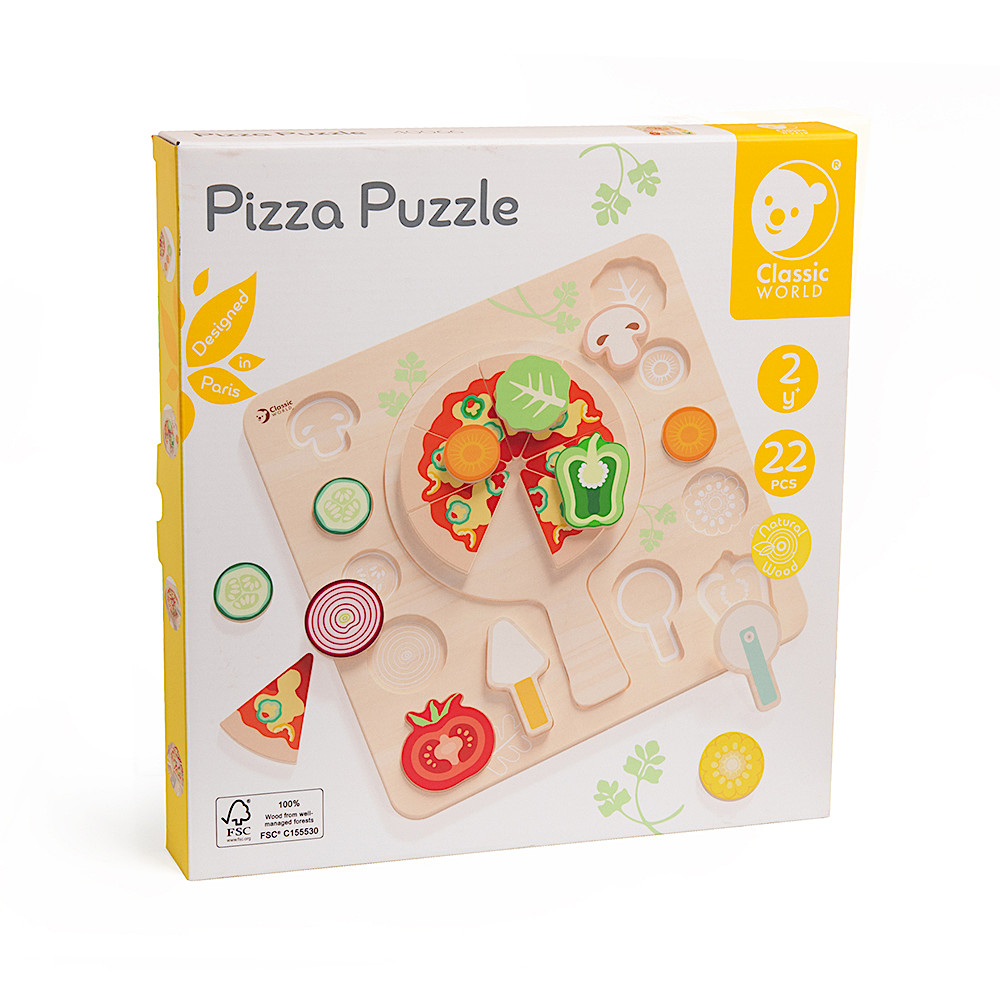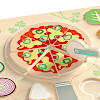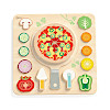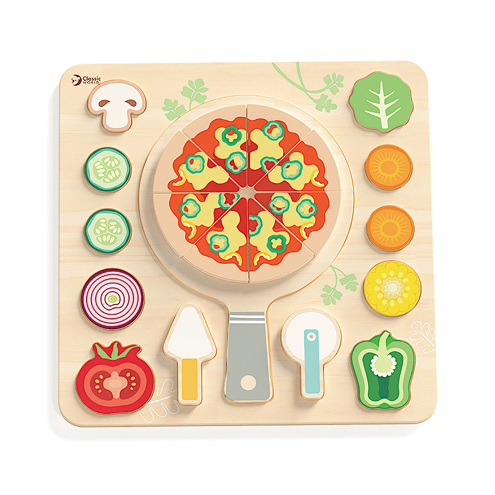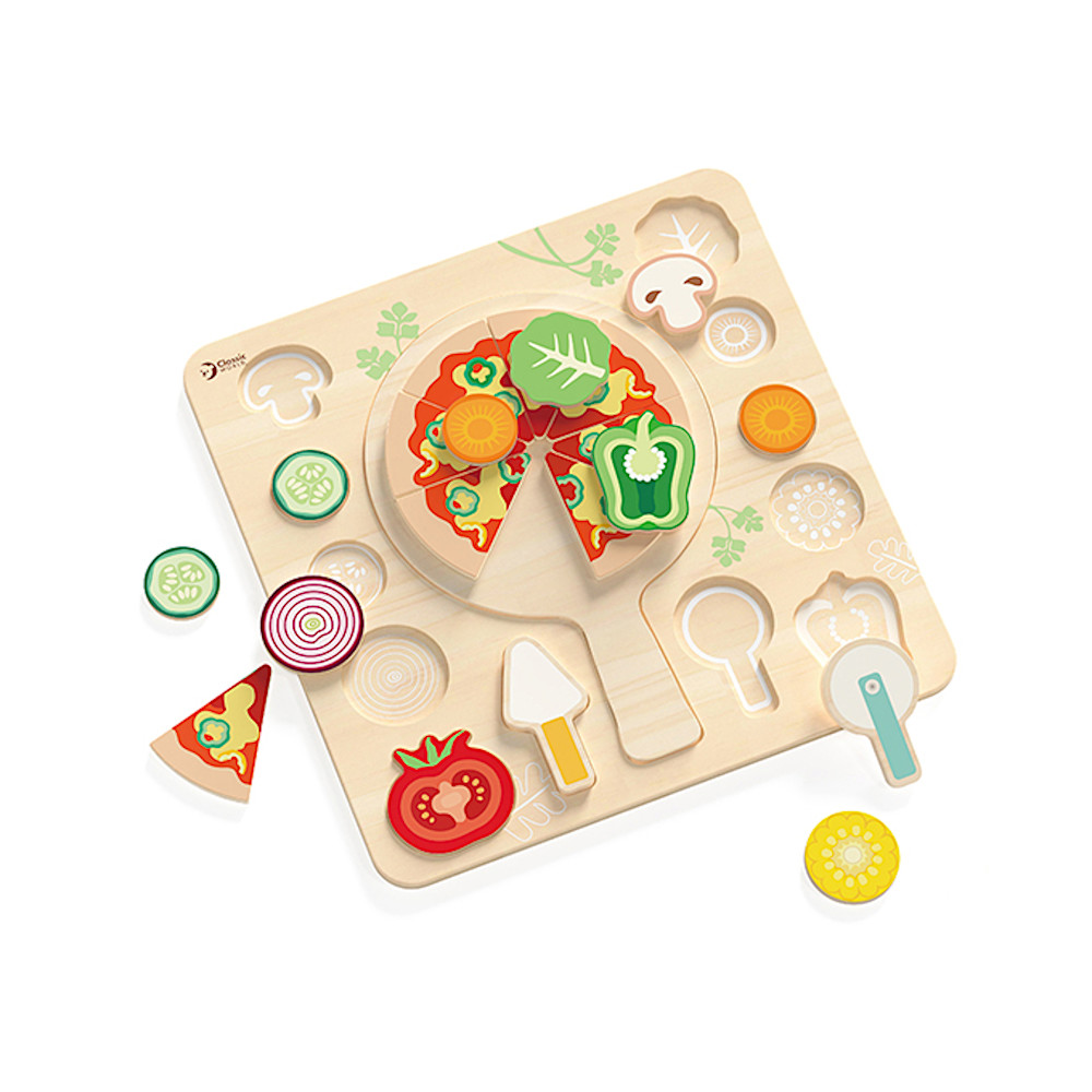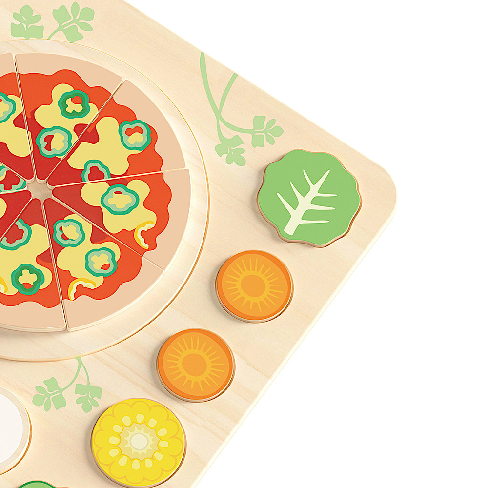 パズルとしてもままごととしても使えるのがおもしろい玩具です。野菜がパズルのように木製のボードにはめ込まれ、それを外してピザの具材にします。ピザはスライスされているので、そのままおままごと遊びに使えます。