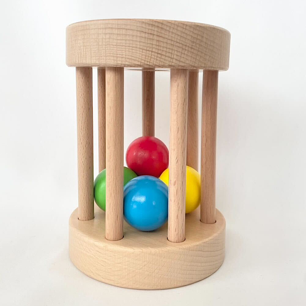 ドラムを転がすと、中のカラフルなボールが跳ねて心地よい音を奏でるおもちゃです。 自分の動きに合わせて音が鳴るという「原因と結果」の発見が、子どもの好奇心を刺激し、遊ぶ中で自然と「繰り返し」の学びを促します。 また、自分の力で追いかけることで、ハイハイなどの運動能力や目と手の協調性を養います。