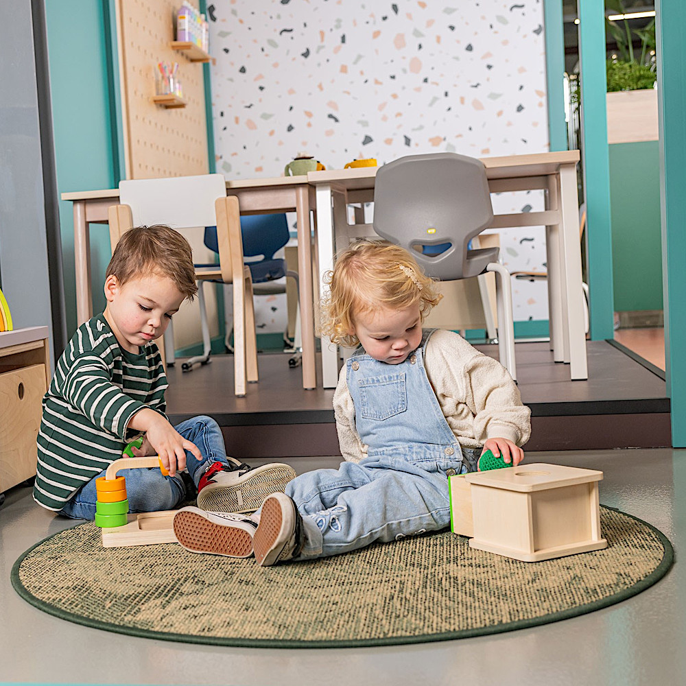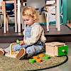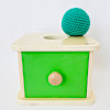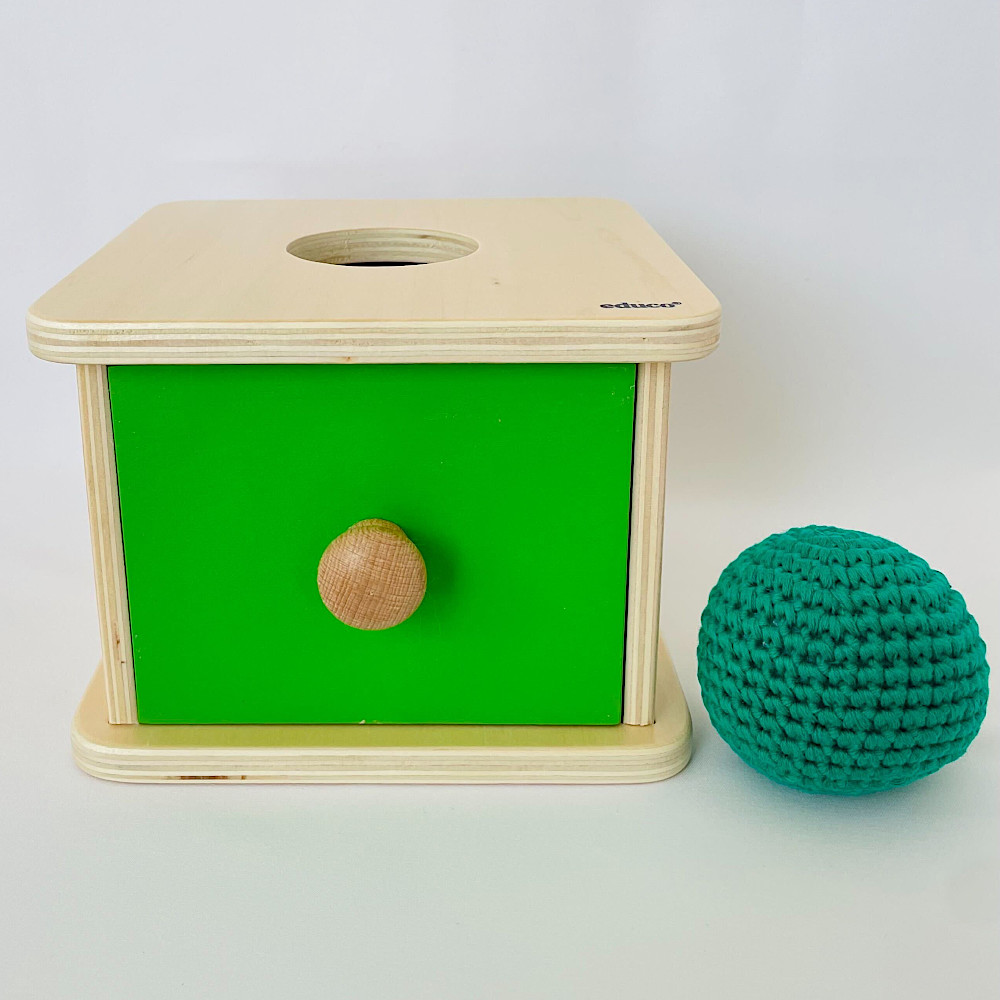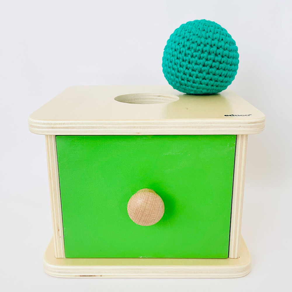 穴から落としたボールを引き出しを開けて取り出すという一連の動作を通じて、「原因と結果」の概念を楽しく遊べる教具です。 柔らかなニットボールを掴んで穴に落とし、つまみを引いて中身を確認するプロセスが、微細運動能力や手と目の協調性を効果的に高め、発見の繰り返しが自信と好奇心を養います。
