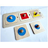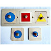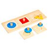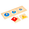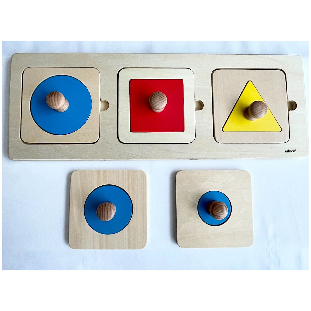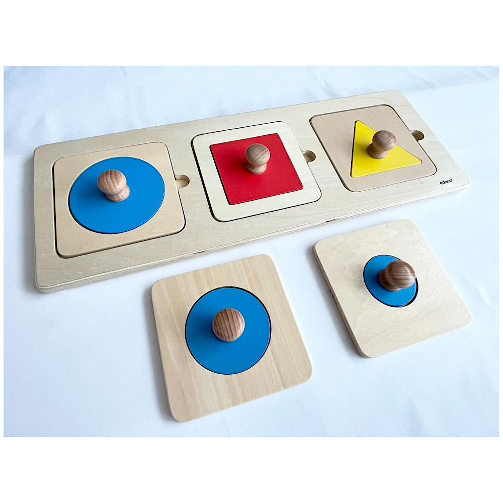丸、四角、三角といった基本的な図形を正しい位置にはめ込んで遊ぶ、シンプルな木製パズルです。 つまみの付いたピースを掴み、正確に枠へ収める動作を繰り返すことで、微細運動能力(手先の器用さ)や手と目の協調性を効果的に高めます。 また、遊びながら「できた!」という自信も養います。
