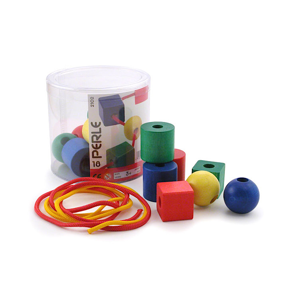 4色各8種類、32個入り。穴の大きさは3種類、はじめは大きい穴のビーズから。ひも2本入り。