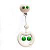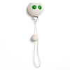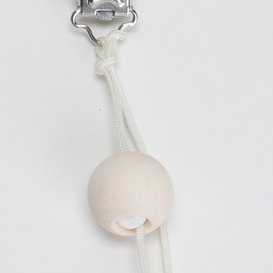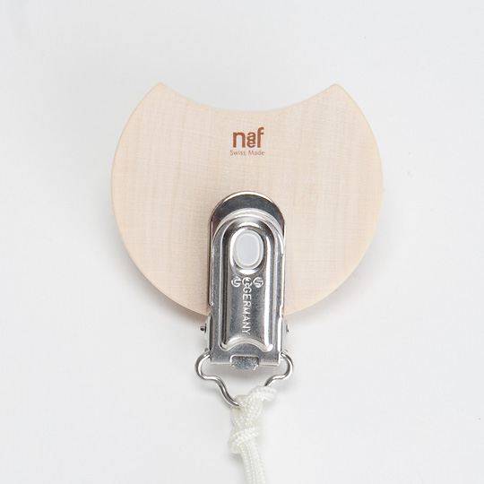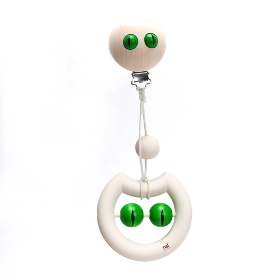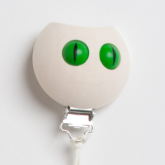 ネフ社のチーフ・デザイナー、ハイコ・ヒリック氏によるベビートイのシリーズです。「ミャウ リング」「ミャウ バギートイ」と近い雰囲気のデザインとなっています。円周の一部を切ったネコの顔のような形状、印象的な緑色と細長い黒目は、統一感出すためか、別パーツの木玉が埋め込まれて、立体的になっています(ただし、固定されていて動きません)。裏面のクリップは、他のメーカーでもよく使われている標準的なタイプです。ドリオ、ベビーボール、ティキなどと同じ化繊で編んだ丈夫なひもが使われ、これまたティキなどと同じサイズの木玉が付いています。