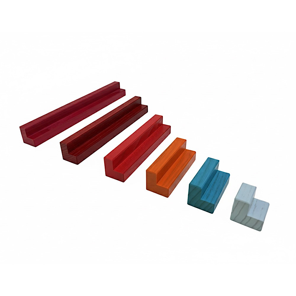 まだ写真しか見ていませんが、長さの異なる2.5cm角の棒がメインパーツのようです。断面が正方形の角4分の1をカットしているので、断面はL字型。なので、玉転がしもできちゃうんですね。玉も付属しています。