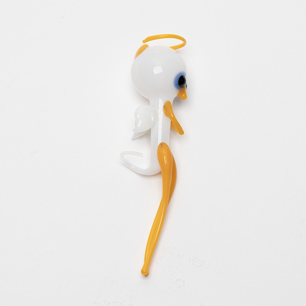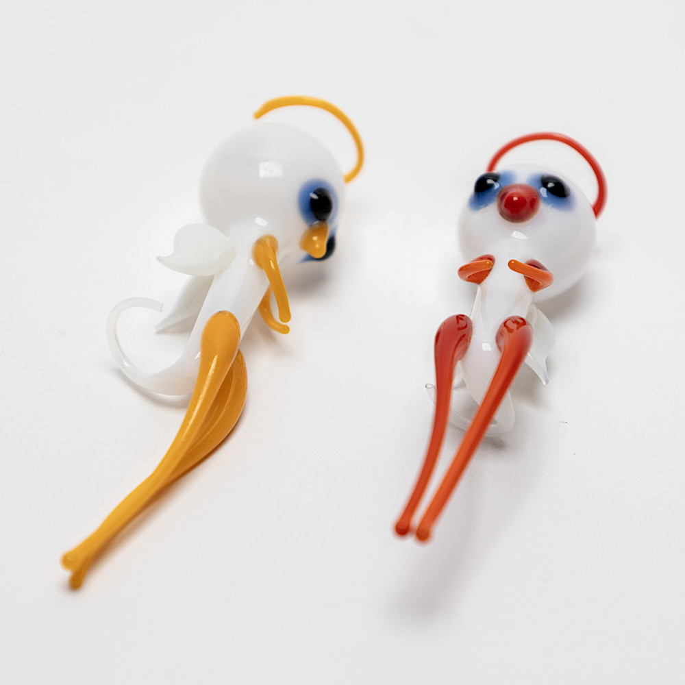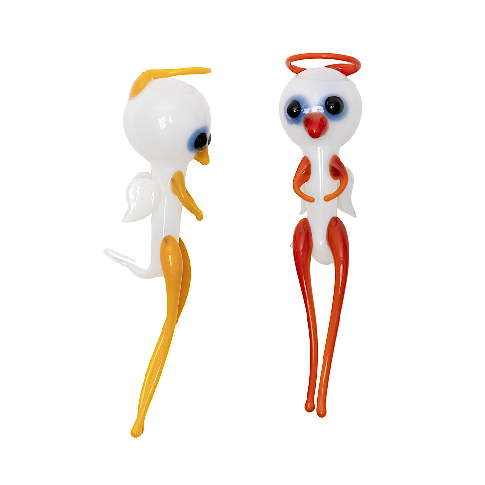 ウォーターエンジェルは口吹きガラス製で、体内は空洞、しっぽの先に小さな穴があいています。これは16世紀のフランスの著名な物理学者で哲学者であったデカルトの考えた原理に基づくおもちゃです。