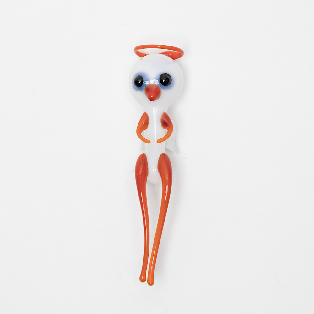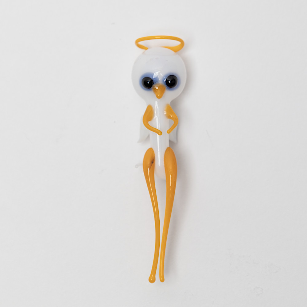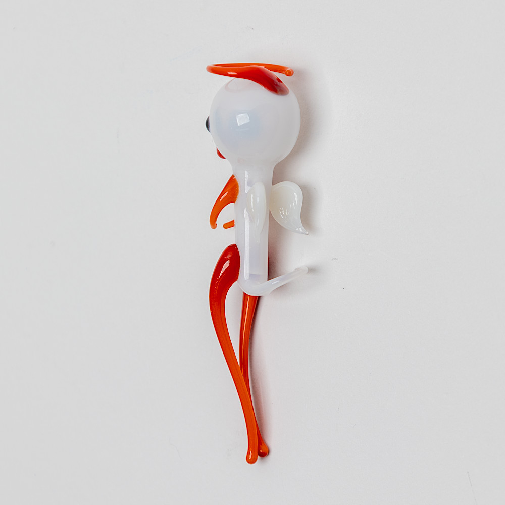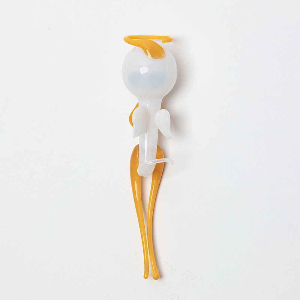 ウォーターエンジェルは口吹きガラス製で、体内は空洞、しっぽの先に小さな穴があいています。これは16世紀のフランスの著名な物理学者で哲学者であったデカルトの考えた原理に基づくおもちゃです。