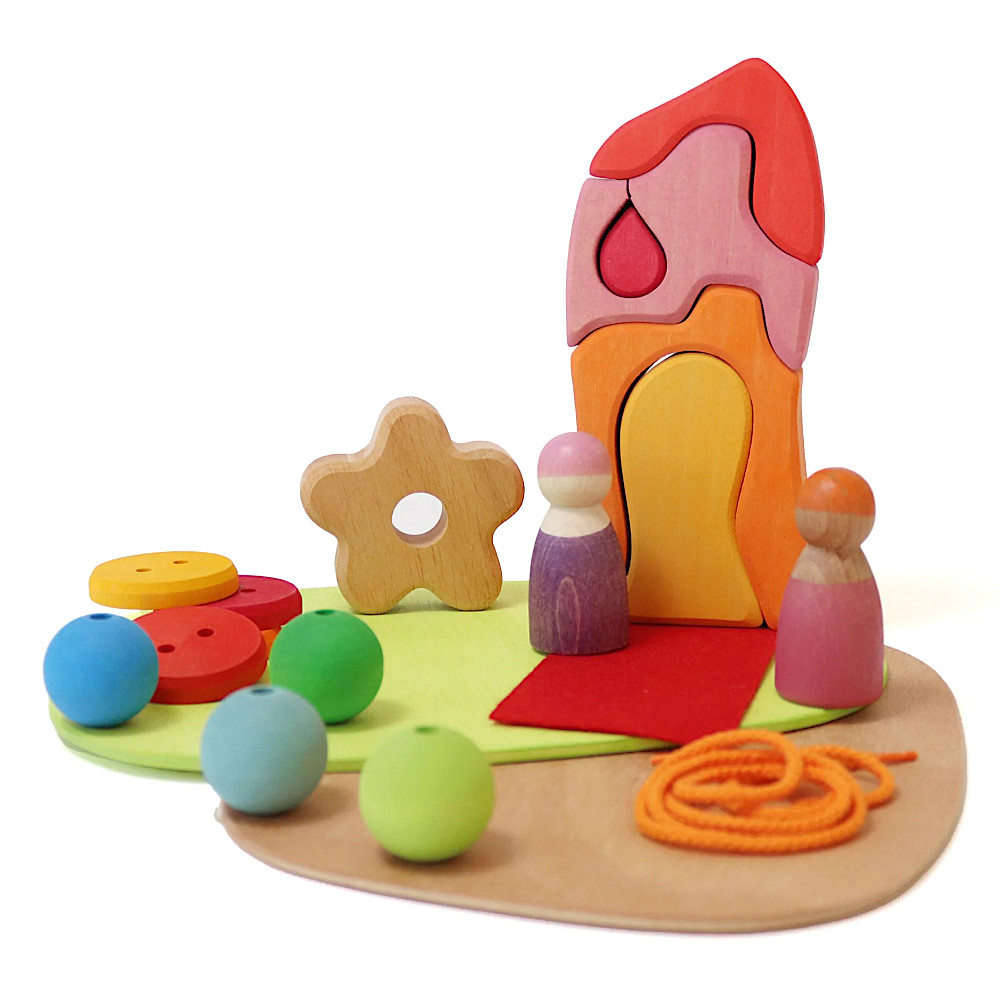 グリムスの自然を体感するシリーズです。 ここに含まれている人形やビーズ、パーツを持ち出して外で遊んでみたり、 あるいは外から自然の植物や木の実、石などを持ち帰って一緒に遊んでみましょう。 もちろんこれだけでも楽しく遊べます。